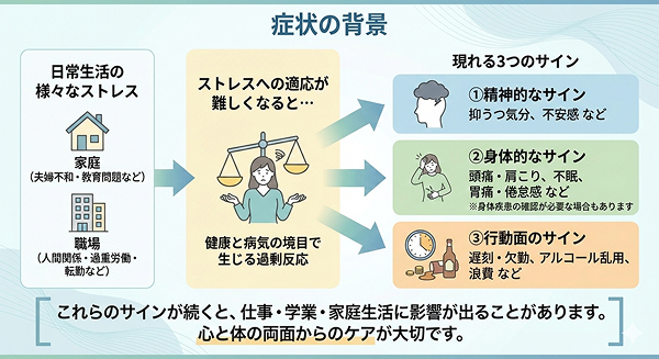 日常生活では家庭問題や職場の人間関係・環境の変化など、さまざまなストレスに直面します。多くの場合は時間とともに落ち着きますが、ストレスにうまく適応できなくなると精神的・身体的な症状があらわれ、生活に支障が出ることがあります。このような状態を適応障害と呼びます。ストレス要因との関連が比較的はっきりしていることが特徴です。